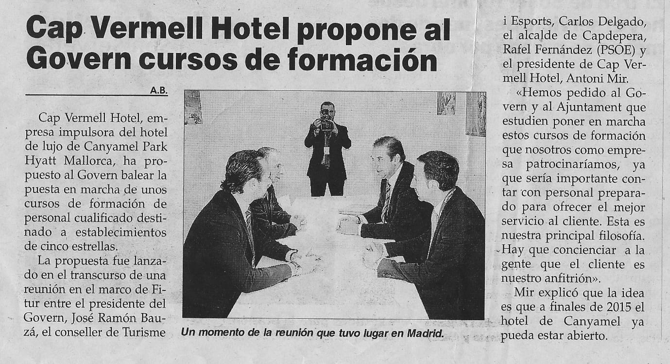 Antonio Mir, estudiante del Master in Business Management en ESERP Mallorca, es presidente de Cap Vermell Hotel, la empresa impulsora del hotel de lujo Canyamel Park Hyatt Mallorca, que tiene su apertura prevista para finales de 2015. Aprovechando la feria FITUR, evento de promoción turística líder para los mercados receptivos y emisores de Iberoamérica, el presidente de Cap Vermell Hotel y alumno de ESERP mantuvo una reunión con el presidente de Gobierno de la Comunidad Balear, José Ramón Bauzá, y propuso la creación y esponsorización de cursos para formar a personal cualificado que trabaje en establecimientos de cinco estrellas. El objetivo que persigue esta iniciativa es una mejora del servicio al cliente en este tipo de complejos hoteleros, en una comunidad en la que el turismo sostiene su economía y que es la columna vertebral de su desarrollo.